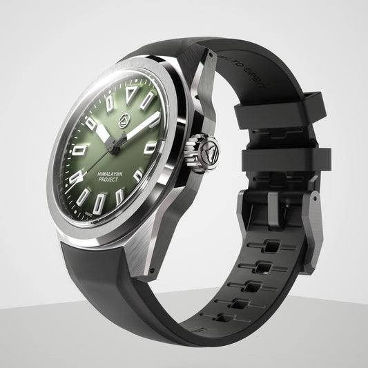 Created to be a pure "Tool Watch", the Himalayan Project was designed with a focus on performance and style. The brand's founders put their skills as car designers to the test and made sure that every line and every feature had meaning, from the elevated Indexes, a nod to the Himalayan topography, to the seamless integration of the rubber strap - everything needed to make sense.
