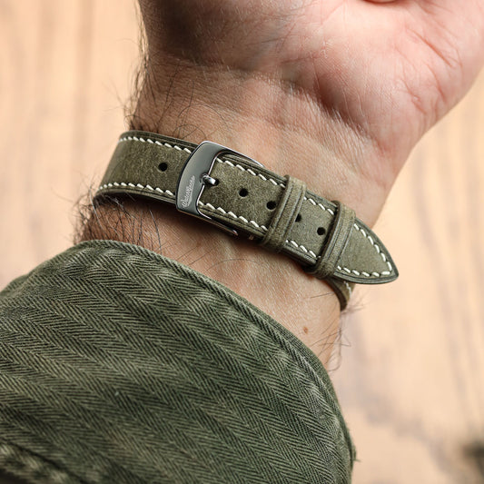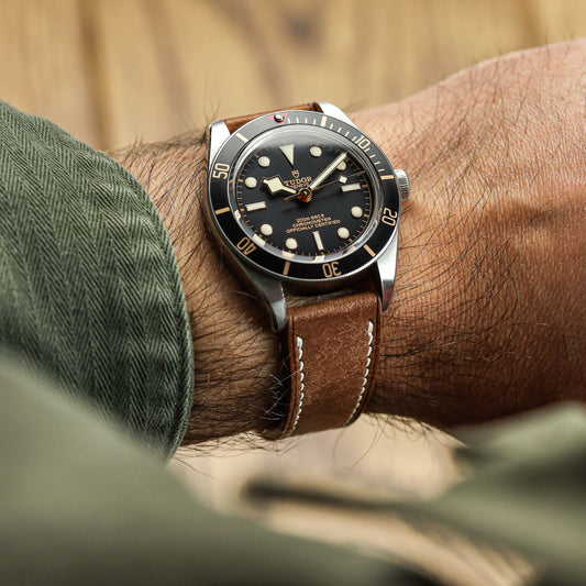 This watch strap is crafted from genuine Badalassi Carlo "Pueblo" vegetable-tanned Italian calf leather. As a result, this strap will develop patina over time and only get better as it wears in and begins to age.