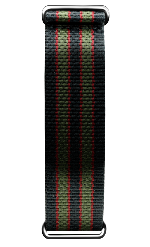 By popular demand this beautifully crafted nylon watch strap features a dark blue base with vintage red and olive green stripes, just like the original.