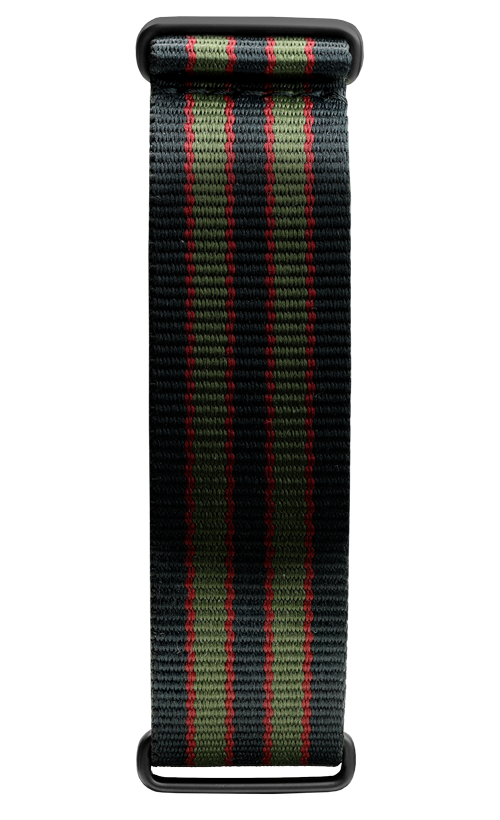 By popular demand this beautifully crafted nylon watch strap features a dark blue base with vintage red and olive green stripes, just like the original.