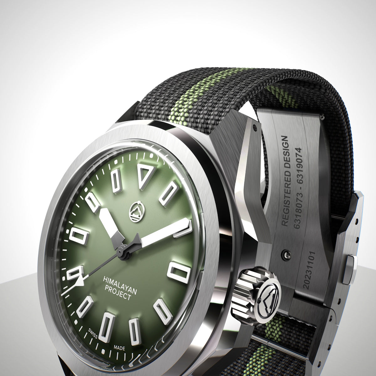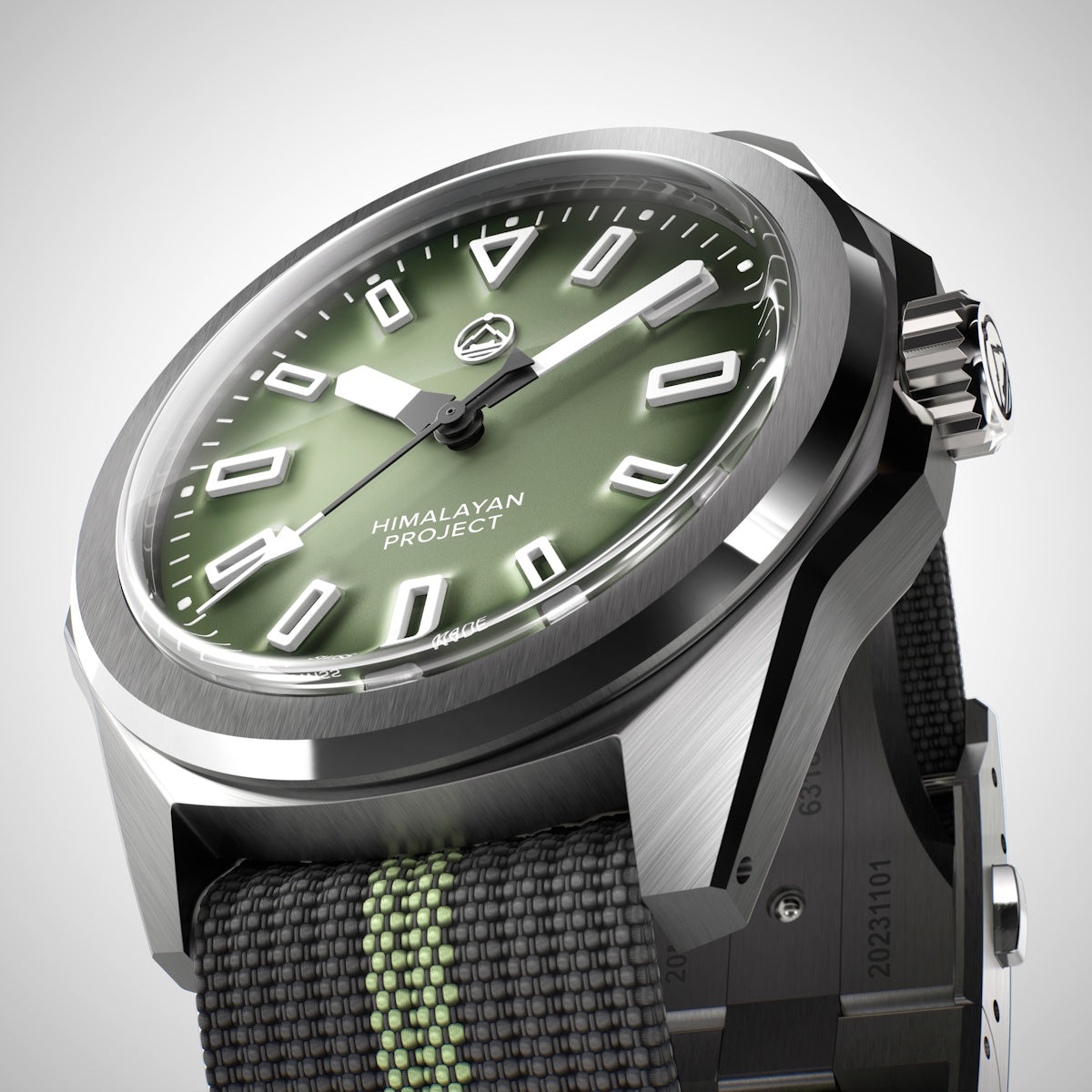 Created to be a pure "Tool Watch", the Himalayan Project was designed with a focus on performance and style. The brand's founders put their skills as car designers to the test and made sure that every line and every feature had meaning, from the elevated Indexes, a nod to the Himalayan topography, to the seamless integration of the rubber strap - everything needed to make sense.