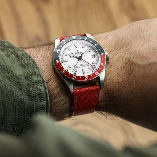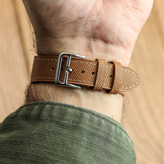 Saffiano leather is celebrated for its iconic crosshatch pattern, achieved through a specialized embossing process that enhances its resilience. Originally developed for luxury goods, it is known for its resistance to scratches and wear, as well as its ability to maintain its structured shape over time. These attributes make Saffiano leather an ideal choice for watch straps, offering an unbeatable combination of style and performance.