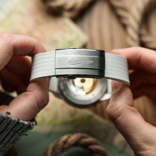 The WatchGecko 400 Italian rubber diver strap with bushed/polished deployant clasp is a high-performance, bracelet-style strap designed for serious use-whether you're exploring the deep or facing the elements outdoors. Now paired with the WatchGecko Divers Deployant Buckle, this strap-and-buckle combo delivers enhanced comfort, refined style, and total reliability.