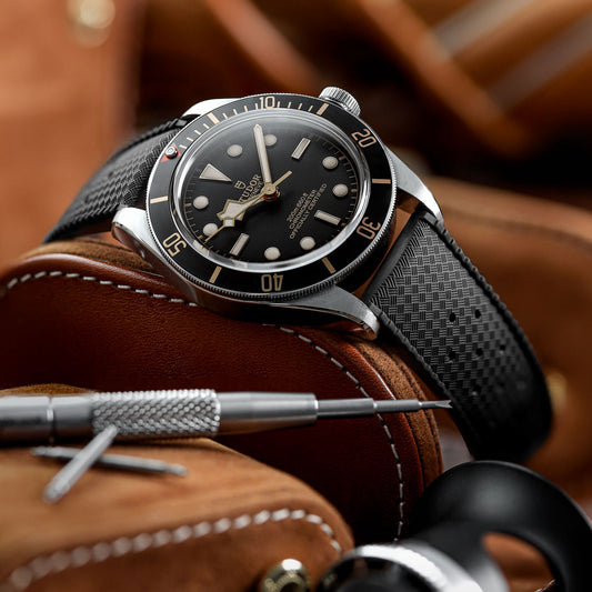 Inspired by the golden age of diving watches in the 1960s, the Vintage Style Perforated Rubber Watch Strap seamlessly blends functionality and sophistication. The design pays homage to tropic straps from a bygone era with a generous tapered tail, classic style keepers, and a period-accurate textured pattern. Yet, it is in every way a thoroughly modern strap, crafted from high-quality rubber and featuring quick-release spring bars.